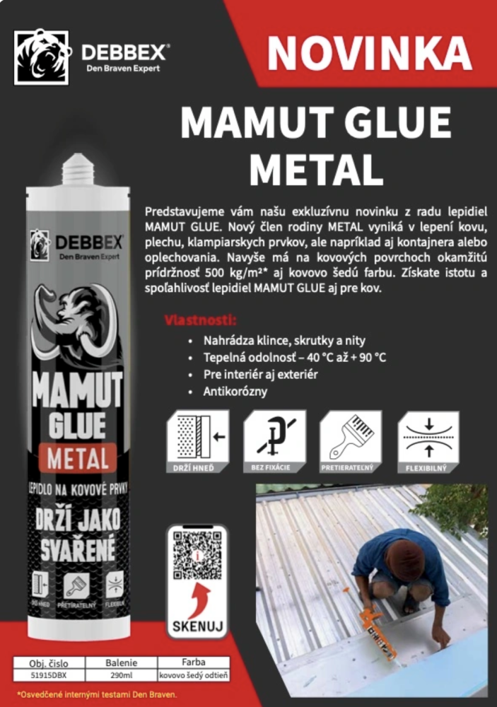 MAMUT GLUE Metal je vysokopevnostné lepidlo sivej farby, ktoré dokonale splynie s kovmi. Ideálne na lepenie kovov, plechov, kontajnerov a klampiarskych prvkov. Ponúka vysokú pevnosť a odolnosť pre náročné priemyselné aplikácie.