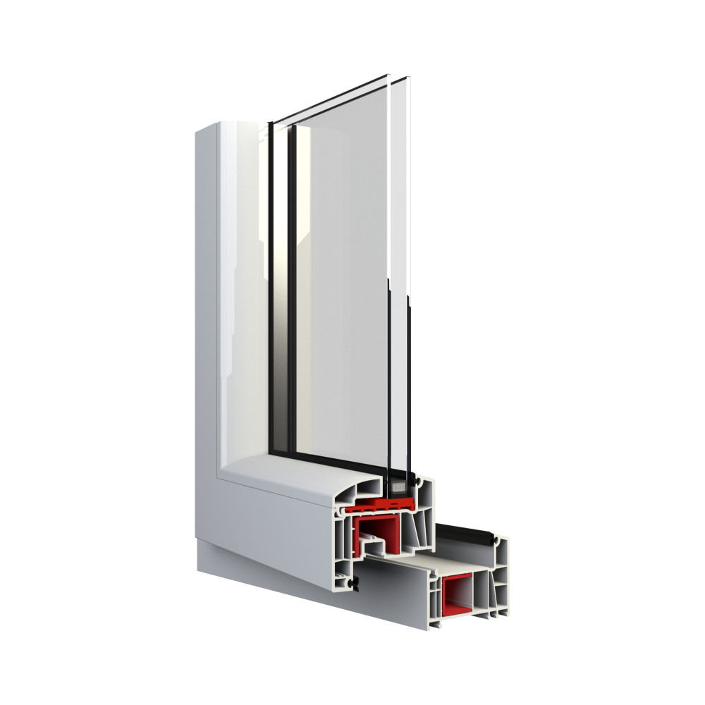 Plastové oknos dvojsklem, rám 70mm - Profil okna: 5 komorový profil rámu a křídla vyrobený výhradně z prvotního materiálu ve třídě A, s hloubkou 70 mm, tloušťka do 40 mm. Ve standardní sadě jednokomorové sklo s parametry pronikání tepla Ug = 1,0 W/(m2K) wg PN-EN674. Možnost instalace kompletu se třemi skly o parametrech Ug = 0,7 W/(m2K). Rám: Ve standardu pozinkovaný, ocelový rám. Kování: MACO MULTI MATIC KS se dvěma držáky proti vloupání ve standardu. Povlak Silver-Look a podélné zahloubení na zásuvce. Okno vybaveno blokádou proti špatnému zamknutí kliky, zvedákem křídla (u oken nad 90 cm) a mikro ventilací. Posílení: Posílení rámu - ocelové. Těsnění: Okno vybavené systémem trojitého těsnění: vnějšího, vnitřního s EPDM a centrálního ze zpěněného EPDM. Barevná škála: vnitřní/venkovní bílá/bílá, bílá/zlatý dub, bílá/antracit. Zvuková izolace: Rw= 34-44 dB v závislosti od použitých okenních komponentů. Tepelná izolace: Uw = 1,2 W/(m2K). Průvzdušnost: C4 Odolnost vůči vodě: 9A Odolnost vůči větru: C4 Certifikát: CENTRUM STAVEBNÍHO INŽENÝRSTVÍ a.s. č. CV – 16 – 415/Z