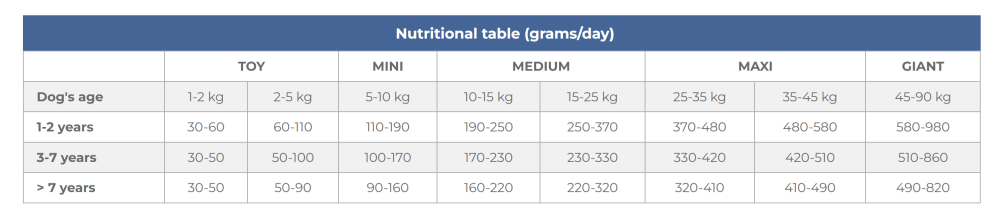 Zloženie: sušené mäso (20 %), tvrdá pšenica (celozrnná 8 %), ryža, kukurica, sušená modrá ryba (10 %), rybí tuk (6,5 %), strukoviny (vicia faba minor – bôb konský 2 %), sušená repná dužina, kukuričný glutén, olivový olej (1 %), mikronizovaná múčka zo sušených strukov rohovníka obyčajného (karob), minerálne látky, sušené paradajky (0,2 %), extrakt z gaštanu.