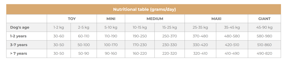 Vždy zabezpečte prístup k čistej a čerstvej vode. Odporúča sa rozdeliť dennú dávku do dvoch samostatných porcií. Odporúčané množstvá sú orientačné a mali by byť prispôsobené špecifickým nutričným potrebám psa.