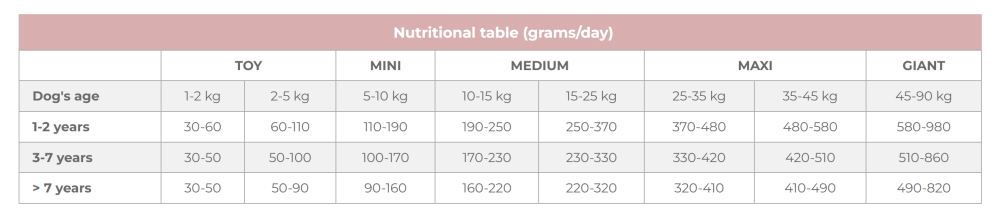 Vždy zabezpečte prístup k čistej a čerstvej vode. Odporúča sa rozdeliť dennú dávku do dvoch samostatných porcií. Odporúčané množstvá sú orientačné a mali by byť prispôsobené špecifickým nutričným potrebám psa.